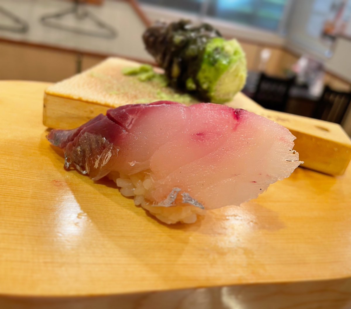 生で食す上質の関鯖は鯵に近いと思う店主ですので、こちらの特大放血脳天神経〆の鯵も、生姜や葱を使用せず本山葵のみで握ってみました