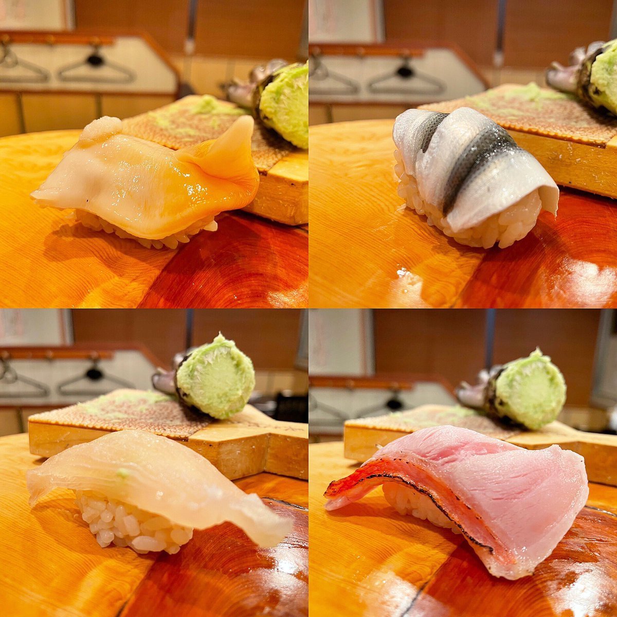 左上より時計回りに) #蝦夷石陰貝 ・ #新子 ・ #金目鯛 ・ #石鰈 昆布〆