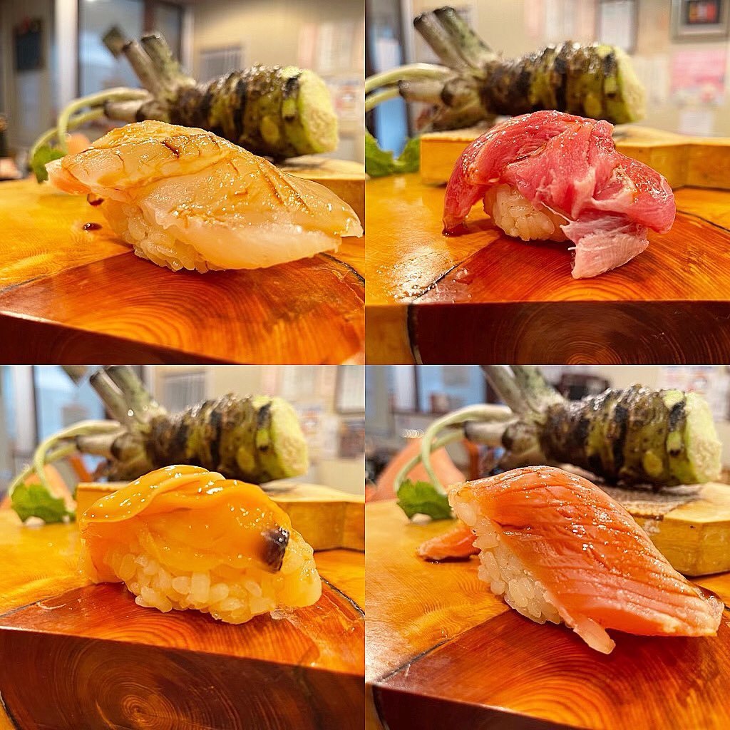 左上より時計回りに) 産地&仕入れ仲卸厳選 #九絵 ・大間産 #本鮪 ・産地&仕入れ仲卸厳選 #銀聖 ・北海道 殻付き #バカガイ