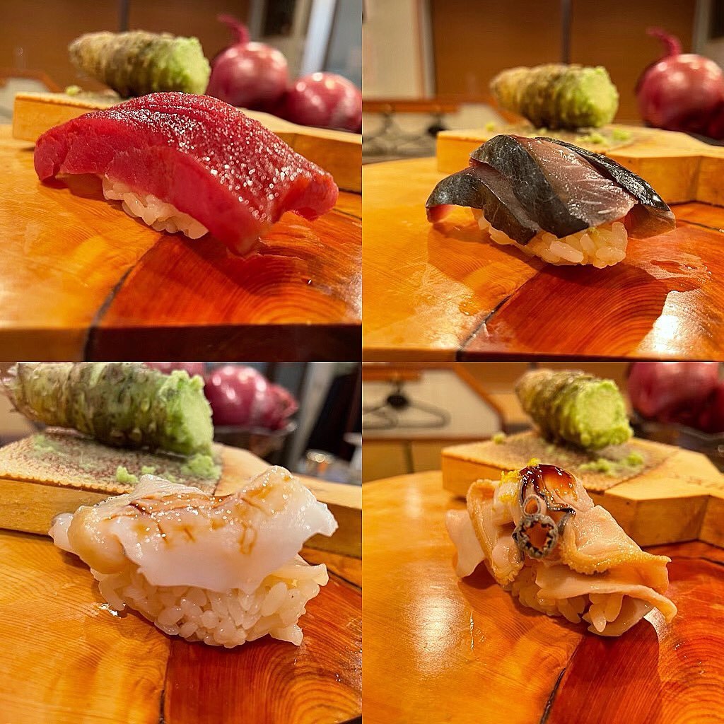 左上より時計回りに)大間産 天然本鮪 赤身 ・長崎産 天然 釣り #真鯖 ・千葉産 #煮蛤 ・北海道 ツブ貝
