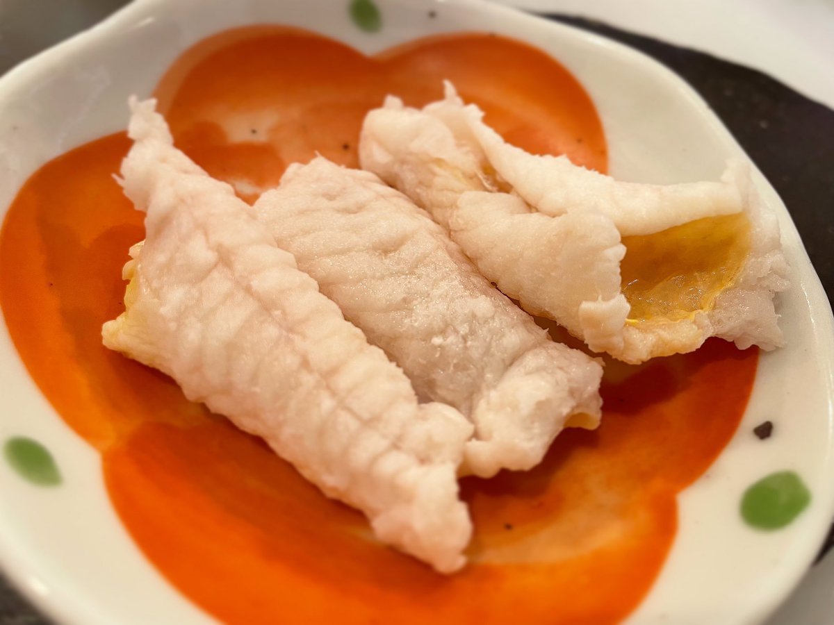 薄皮と呼ぶには、イメージに反し美味しく食べられるので、当店では〝河豚の身皮の部分〟とご説明し、お造里と一緒にご提供しております