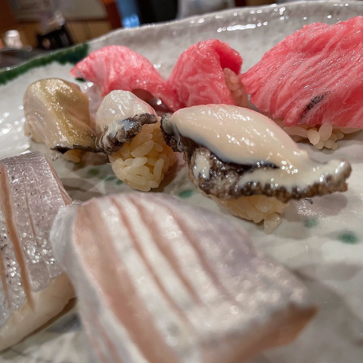奥から) 天然本鮪カマトロ ・鮑 ・エボダイ