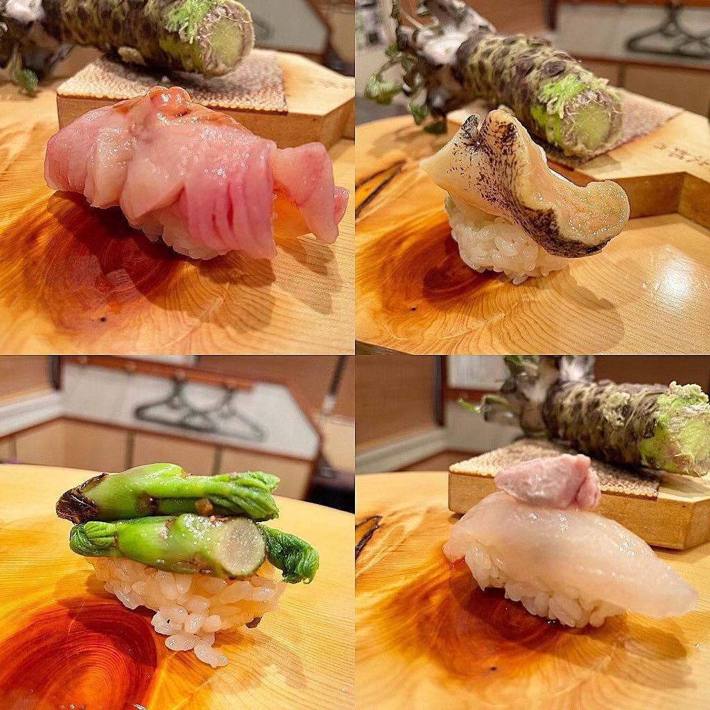 左上より時計周りに) 赤貝 ・ツブ貝 ・皮剥 ・タラの芽のべっこう寿司